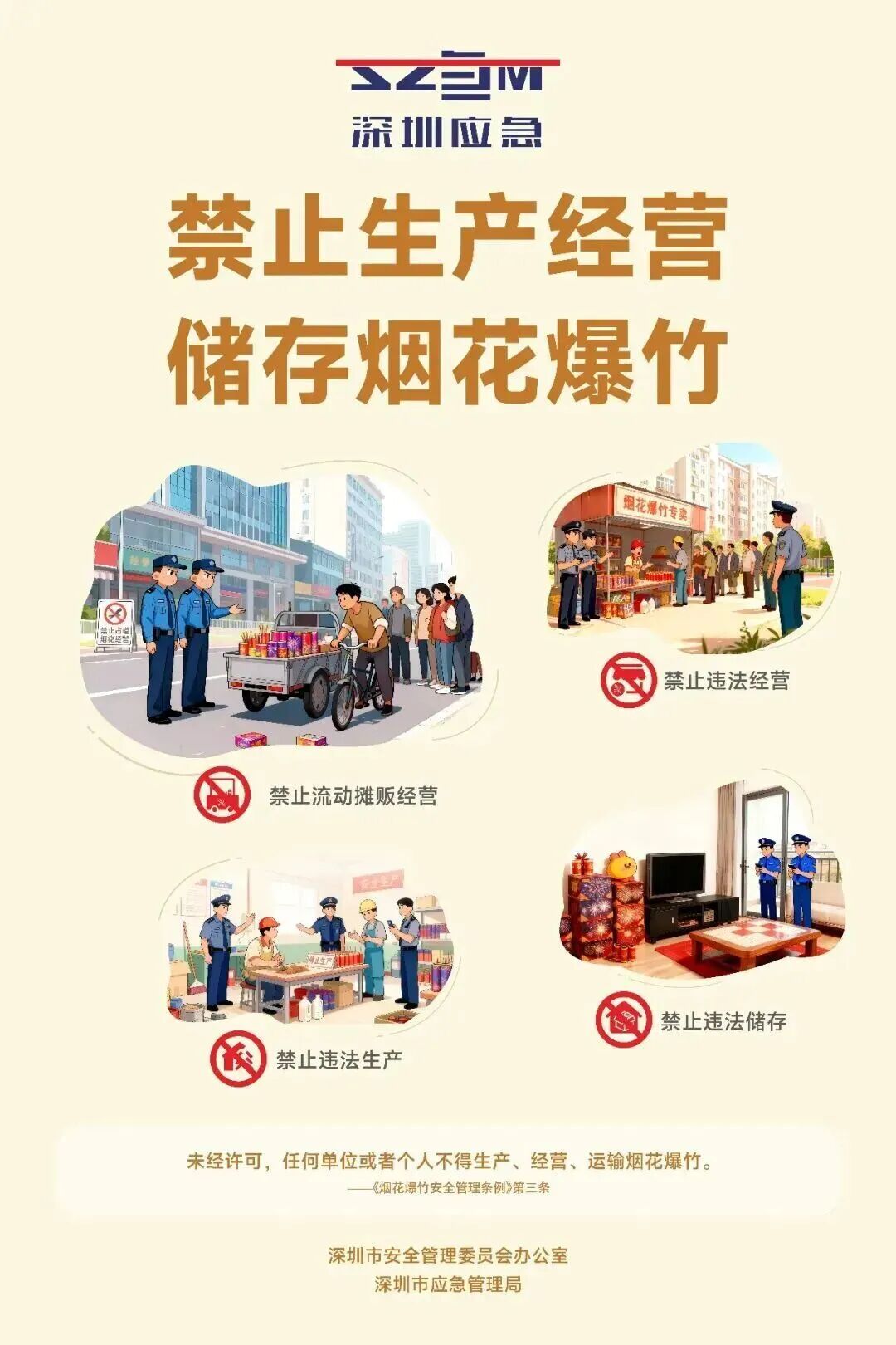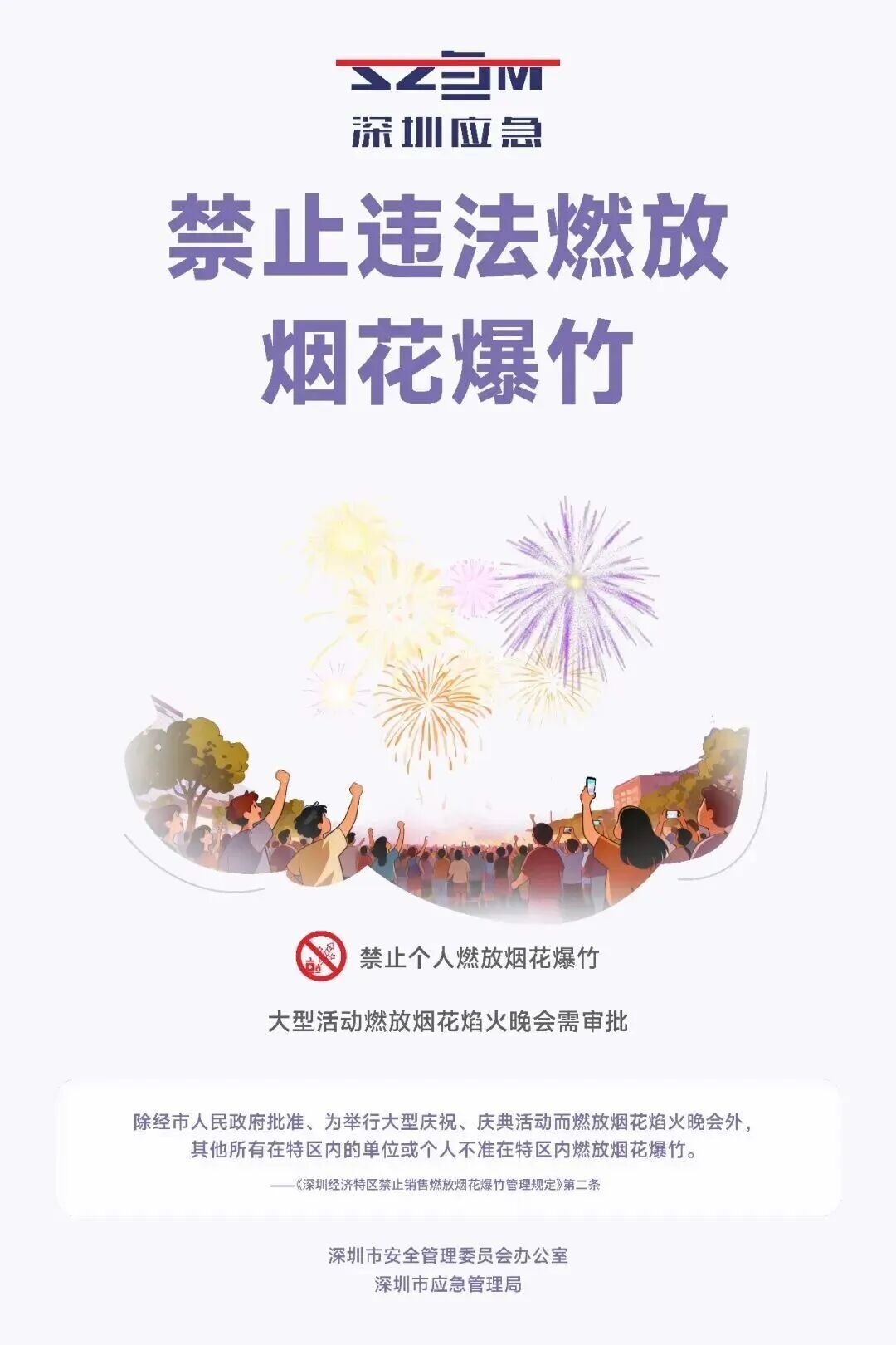 深圳市全年全域禁止燃放烟花爆竹。为了您和他人的安全,请务必严格遵守规定,严禁购买、运输、存储、燃放烟花爆竹。